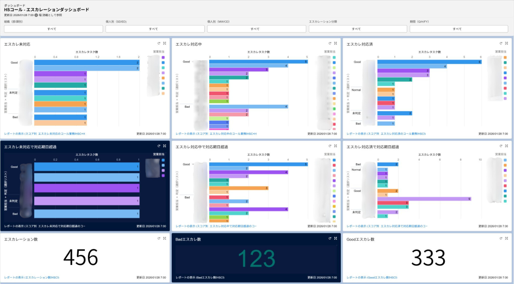 現状「Growwwing」にて可視化できるダッシュボードとしては、統合されたCS活動の全体像とともに、更新率に絞ったものやHSコールに関するものなど複数種類が用意されています。「ばらつきはあるものの、Good・Badスコアも含めて営業側にエスカレーションしており、それらの数字もダッシュボード上で可視化できるようになっています」と横川氏は説明します。